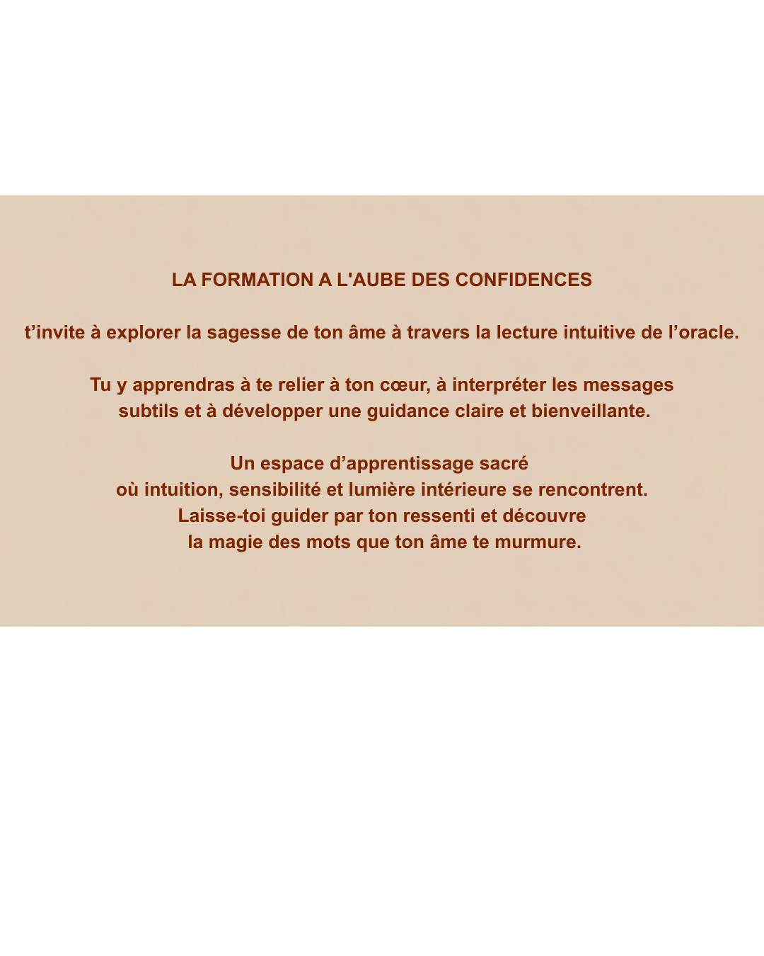 À travers des modules clairs, progressifs et profondément connectés à la pratique, je vous guide pour vous approprier l’Oracle À l’aube des confidences, à votre rythme, dans une approche à la fois structurée et intuitive.